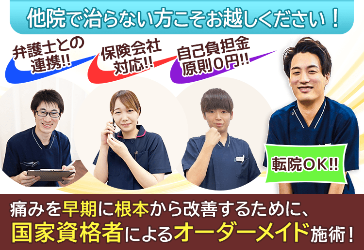 むちうち被害者の方々に一日でも早く回復していただけるよう、スタッフ一同全力でサポートをさせていただきます。